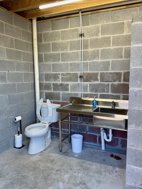 Plumbing is almost complete. The bathrooms are functional, have lights, hand dryers, and showers. Changing stations, towel hangers and door indicators are pending.