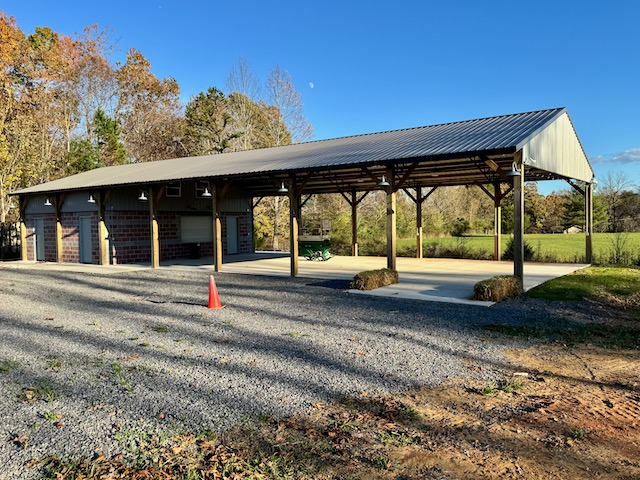 The pavilion includes a 32′ x 84′ roof with a poured concrete floor. Additionally there is a 30′ 6″ x 24′ building that houses a kitchen, two bathrooms, a storage room and bonus area second floor.